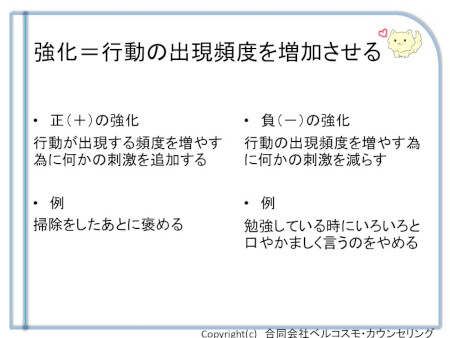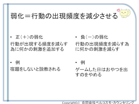 この「負の弱化(得られるものが得られない)」を使う素晴らしい方法は、実はかなり間違えて使われているというアメリカの研究もありますが、2歳から8歳くらいまではこの方法で子どもの暴力は殆ど無くなるというABAの第一人者の奥田健次先生の実践結果もありますので、やはり「行うやり方」が大事ということなのでしょう。